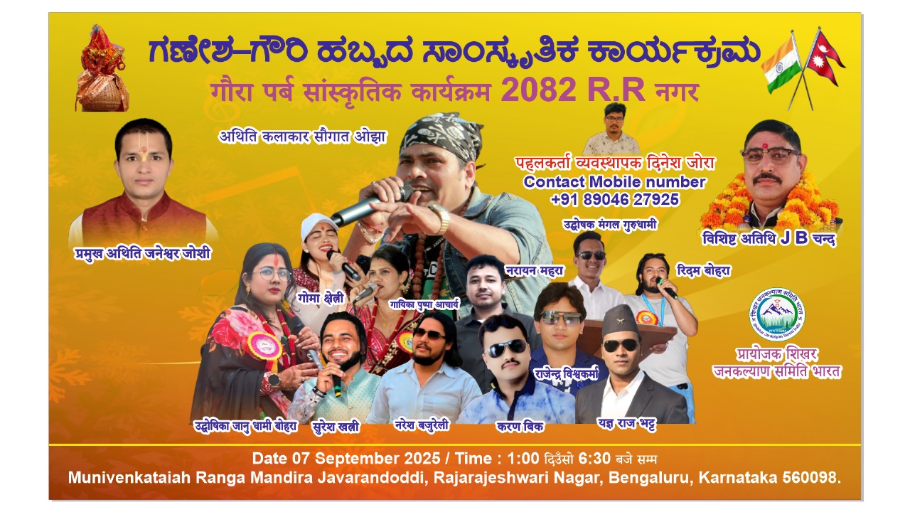 भारत प्रवासमा रहेर पनि नेपालीपन, मौलिकता, संस्कृति र चाडपर्वको संरक्षण तथा सम्बर्द्धन गर्ने उद्देश्यले “सहयोगात्मक गौरा पर्व सांस्कृतिक कार्यक्रम २०८२” आर.आर. नगर, बेङ्गलोरमा आयोजना हुने भएको छ।